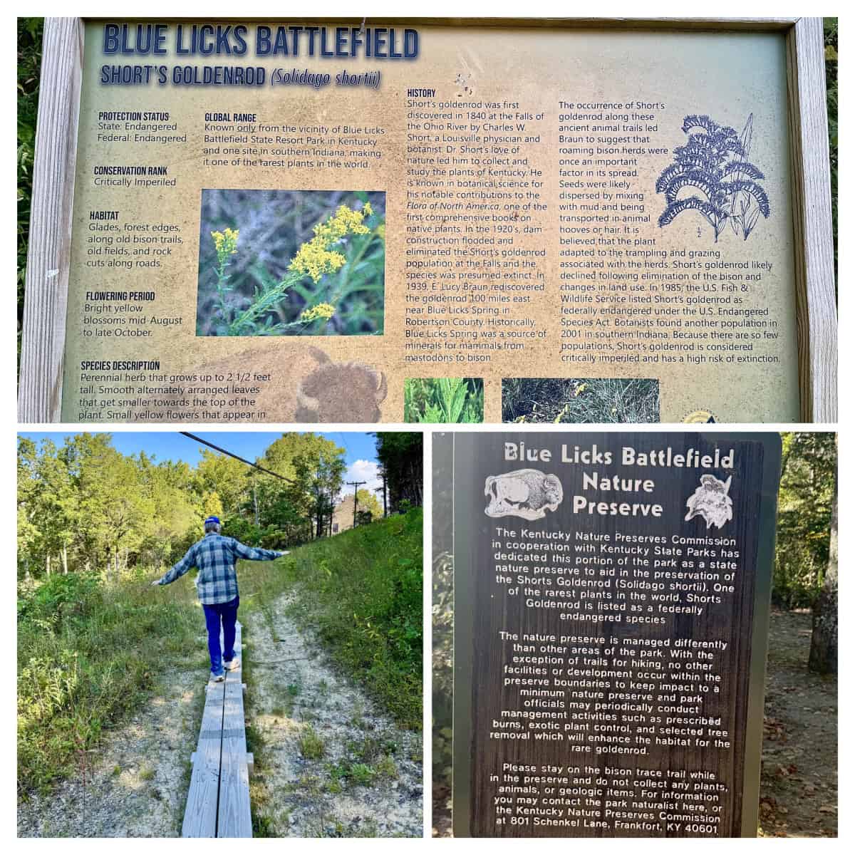Blue Licks is also home to the endangered Short’s goldenrod, which is protected in a 15-acre area of preserve at the park. Short’s goldenrod is historically linked to the Buffalo Trace hiking trail that is also within Blue Licks Battlefield State Resort Park. Cindy and I hiked that trail during this stay, as you can see in the photo album.