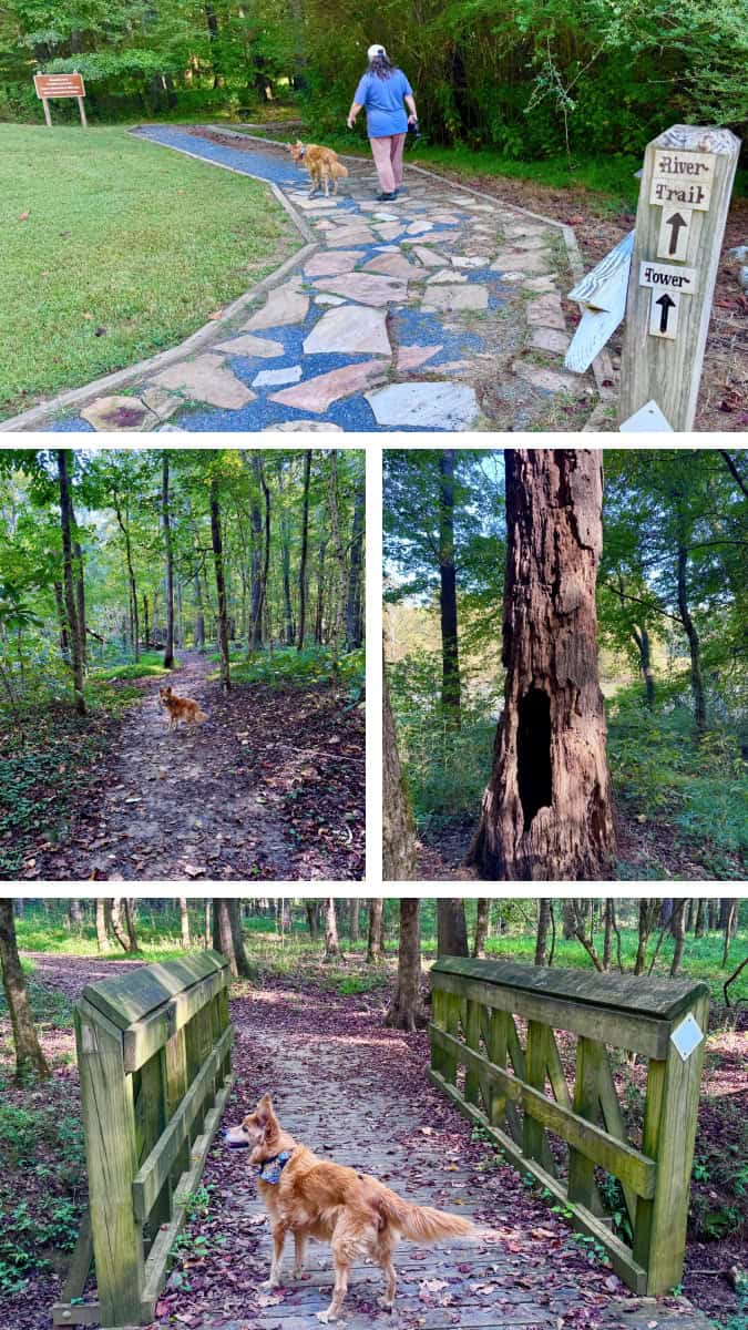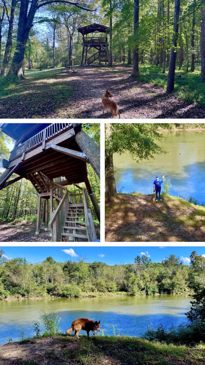 Thursday morning after breakfast we drove down to the trailhead near the boat ramp so we could check out the Tower Trail. The Tower Trail is part of the longer 5 1/2 mile trail and is only 2 miles roundtrip, which is more our speed, lol. Most of the trail is in the woods so we had a nice, shady hike through the trees. Part of it was close to the river, so we got some nice views of the muddy, sometime brown and sometime blue water as it slowly flowed by the shore.