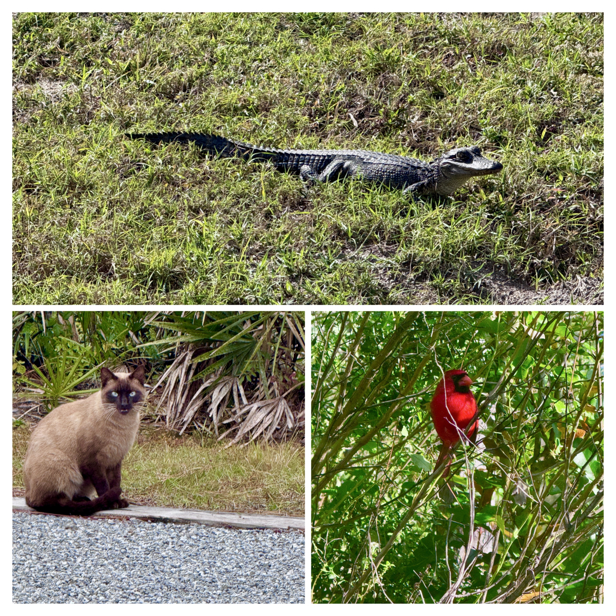 We saw white-tailed deer, a red-shouldered hawk, a baby alligator and an attack cardinal during our time there.
