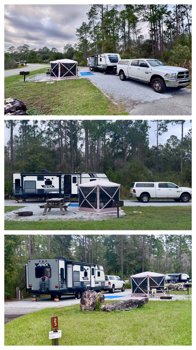 We, of course, were in the RV campground which was a single loop with approximately 30 sites. Our site was a long pull-through site with 50-amp electric and water. I also set up Cindy’s screen room (which is on its last legs after 3 years of continuous use) and added Xmas lights to it for her seasonal enjoyment.