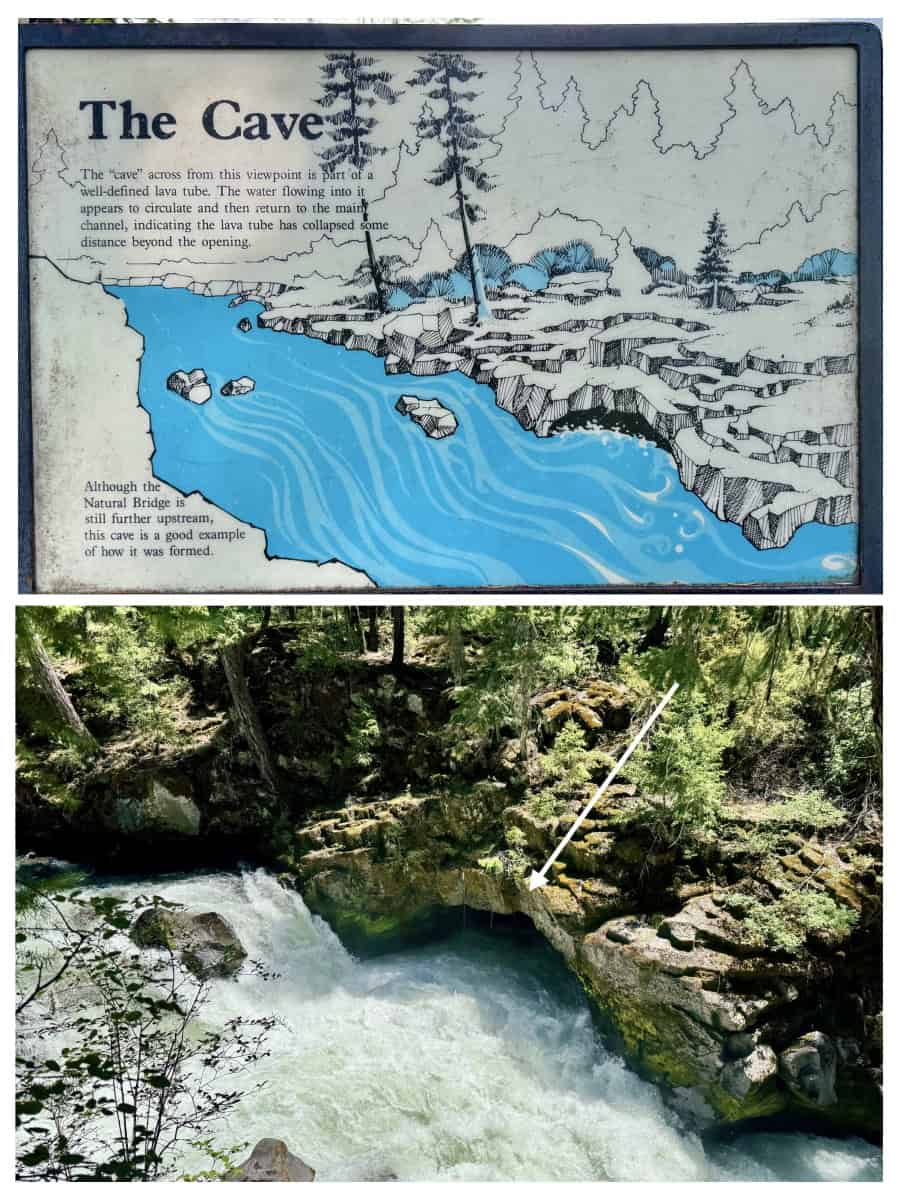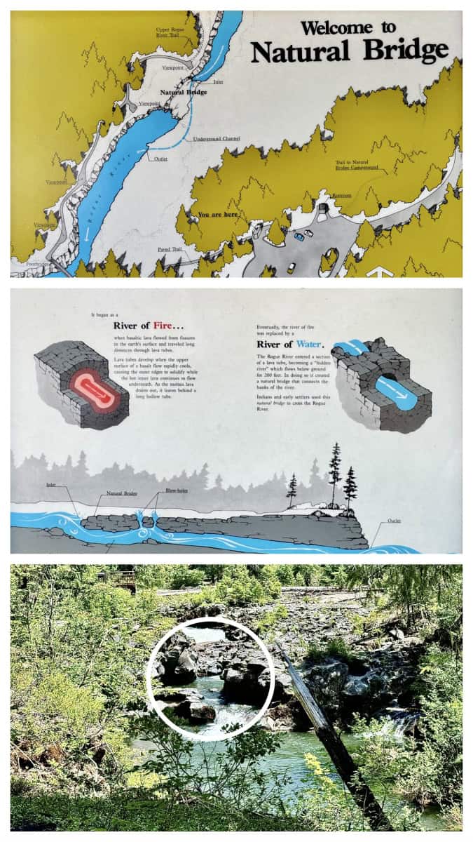 Then it was on to Natural Bridge. You’re not sure WHAT it’s naturally made of until you arrive and find that water flowing through tubes of lava left a natural rock and lava bridge. The water still flows today (from the Rogue River, like the Gorge) and makes it difficult when the water level is high to see the bridge from some angles along the hiking trail. But look carefully at the photos and video and you can see I tried to make sure you could see it as we did.