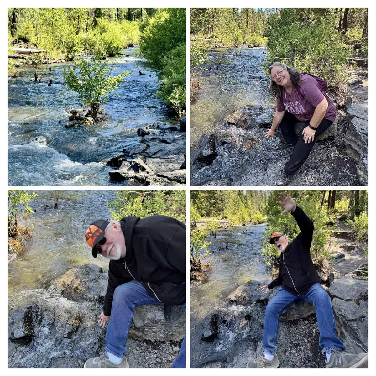 We stopped and took an opportunity to feel the cold water flowing through the lava beds and rocks, and, as you can see in the photos Cindy caught me falling off a rock as I started to stand up from sitting on it.