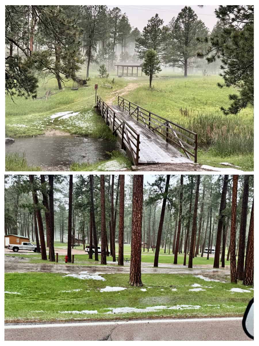 We were going to drive the Wildlife Loop one more time, but it was still raining AND foggy AND, as we got to the higher elevations there was hail! It looked like snow on metal roofs and bridges and the edge of the road, but it was hail. We tried driving a couple of miles on the loop but the weather was so bad that we decided to turn around and head back to the campsite.