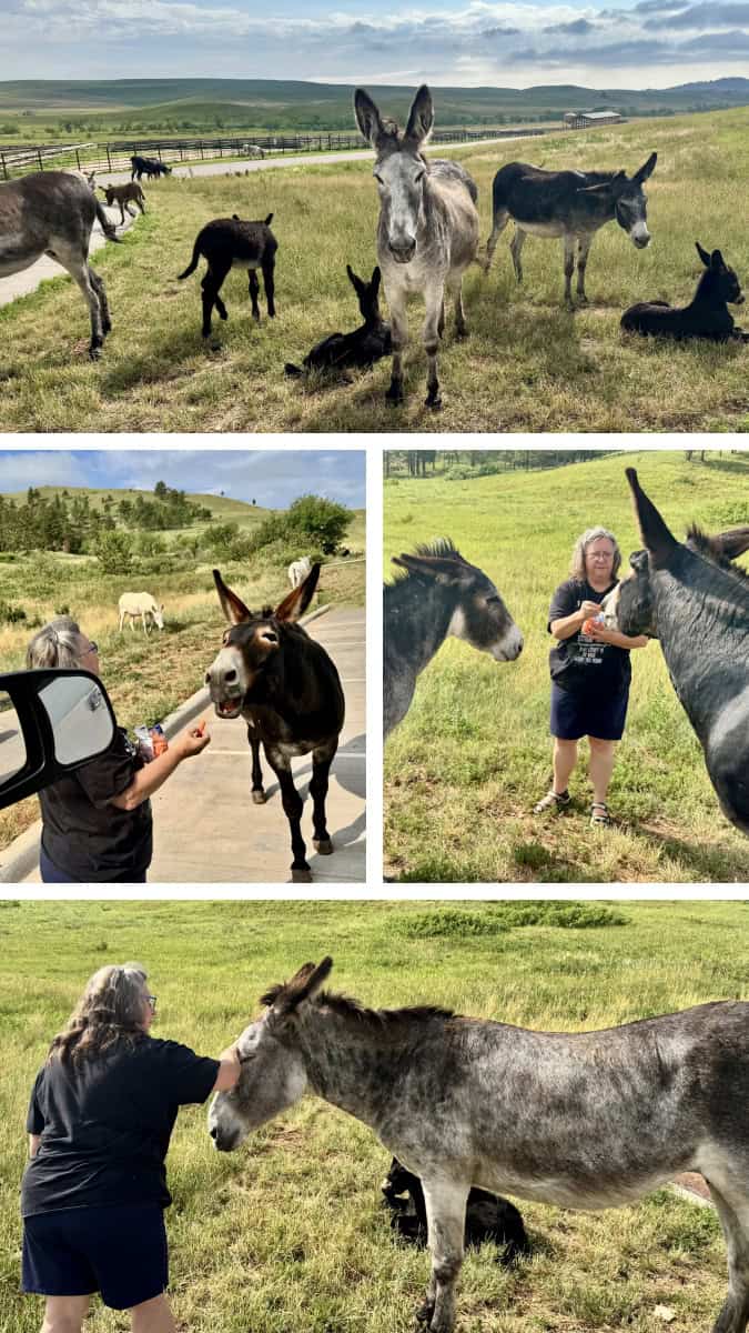 Cindy feeding wild donkeys at Custer State Park on July 22, 2025.