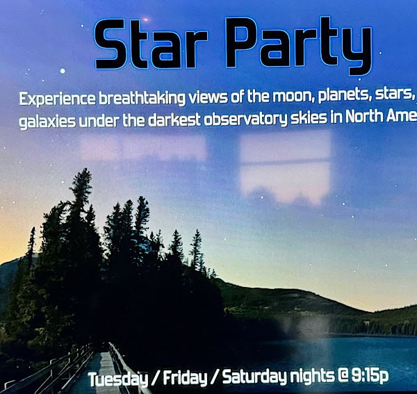 Then you get to go to the telescope park and stop at as many of the 8-10 telescopes they have aimed at various star systems in line of sight from the northern hemisphere as you wish. We were cold (it was 50 degrees) and Cindy was in the beginning throes of some kind of bug or head cold, so we only stood in line at three of the telescopes. The first one was a cluster of stars that was difficult to see, but the second one was a close up view of craters on the moon and the third was a star system that I believe the attendant said was 13 million light years away. Despite the somewhat cloudy conditions, Cindy and I were amazed at the clarity of the view in this telescope. It almost felt like you could have been just hovering out in space in the universe and looking at the stars.