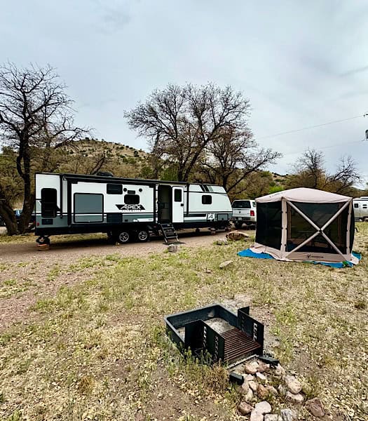 Our site was a pull-through (thanks Cindy!) gravel site that was fairly level, as well as a nice amount of room for Cindy’s screen room. Fire danger was “Extremely High” so a burn ban was in effect. No campfires 🙁 We had FHU of 50 amp power, potable water and sewer connection at the site, one reason we chose this spot. We, or rather I, had a specific task to perform during this stay. Unfortunately we had no T-Mobile signal, less than one bar (is that even possible?) of AT&T and a little bit more of Verizon. That little bit was enough for browsing and email, but not much more.