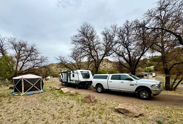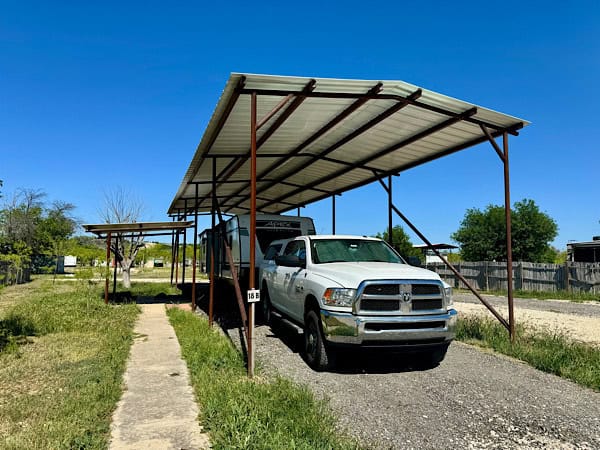 We left Potters Creek on Thursday, April 11th and drove a little less than 3 hours to Stadium RV Park in Sonora, Texas for a one-night stay. This stay had a first for us. The “park” was actually a scattering of sites in the middle of a residential neighborhood. The owner offered a full hook-up (FHU) site for $30 (which is a great price for a private park) but it had to be paid in cash. None of those things was a first for us. The first for us was the site was under a covered roof! We’ve never stayed under a covered roof site before.