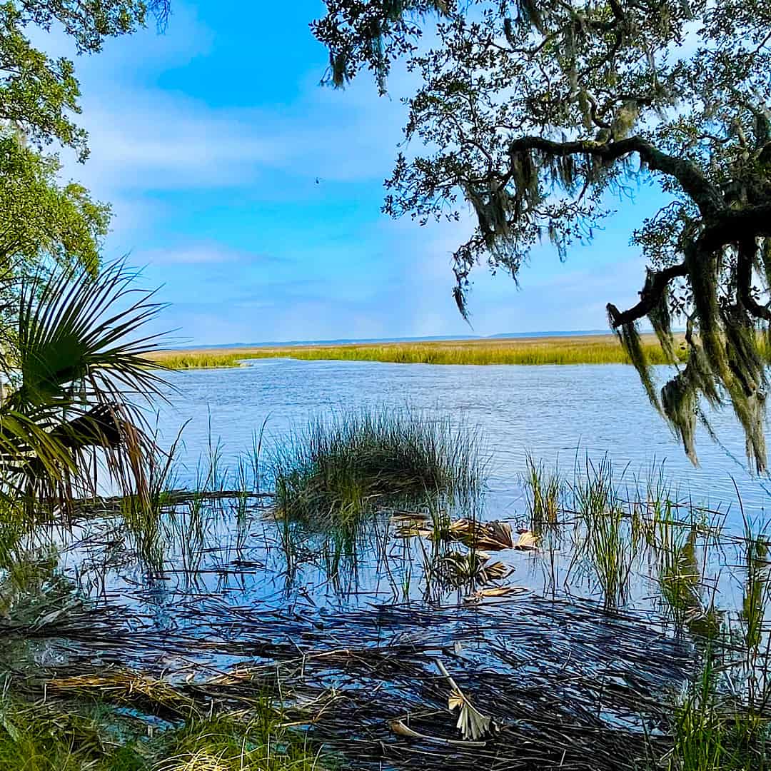 Fort McAllister State Park is located close to I-95 south of Savannah on the banks of the Ogeechee River. It is comprised of 1,725 acres and showcases the best-preserved earthwork fortification of the Confederacy. The earthworks were attacked 7 times by Union Ironclad ships and did not fall until 1864. Visitors can explore the grounds and see cannons, a hot-shot furnace, bombproof barracks as well as a museum and gift shop. There are also 7 rental cottages, 67 tent, trailer and RV campsites, 2 backcountry campsites that you hike a mile and a half to get to, boat ramps, docks, and hiking trails. You cross Redbird Creek, a marshy body of water that borders one side of Savage Island where the RV campground is, to get to the camping area, and then to the other side which is where the Ogeechee River flows past beyond another low, marshy expanse.