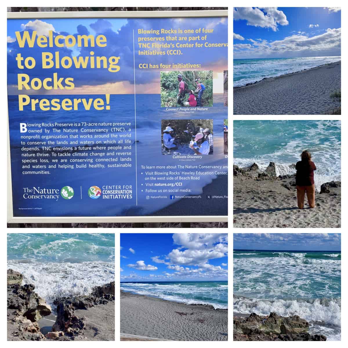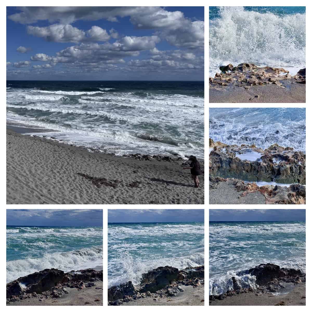 Wednesday morning, just before high tide, we drove down to Blowing Rocks Preserve on Jupiter Beach so Cindy could get her dose of beach sand and waves. Since my knee was still aching I skipped walking through the sand and stayed on the observation deck while Cindy made her way down to the water’s edge.
