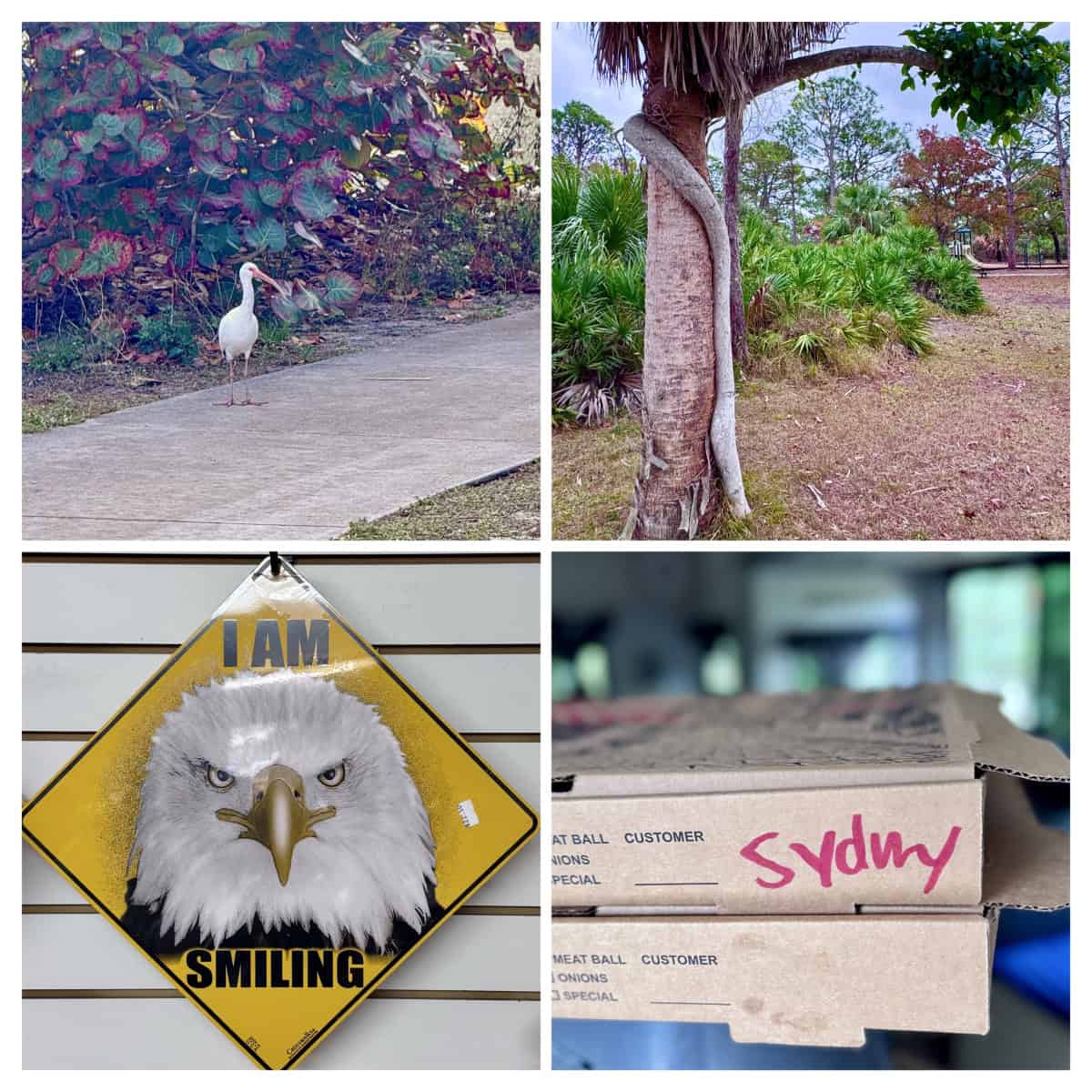 After getting Nomad set up, we decided that we would treat ourselves to our favorite travel-day meal; pizza. We were going to have a pizza delivered from a nearby non-franchise pizza restaurant, but the young lady who answered the phone was such a non-stop talking airhead we decided to just go get it ourselves. I mean, Cindy explained we were at the state park campground, but the girl asked if delivery was to a home or apartment and when we finally made her understand it was a campground she could not tell us for sure that it could be delivered to our site or if we would have to go to the front gate. It just seemed a smarter move to go pick it up. Then Cindy spelled her name to her twice, but when we picked up the pizza the box had “Sydney” written on it. I took a photo just for proof, lol.