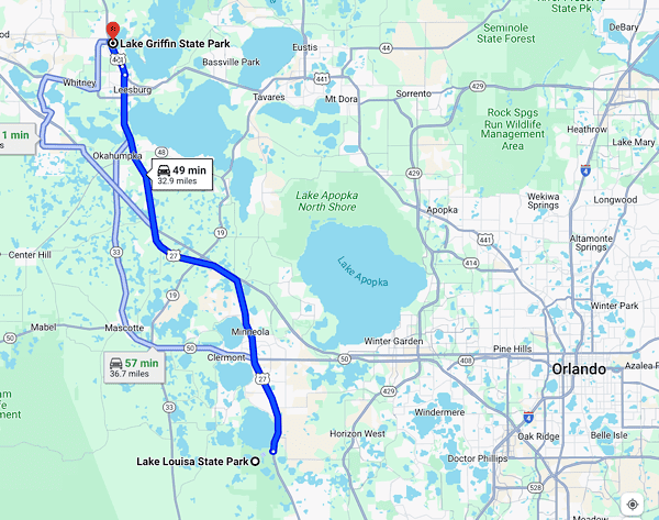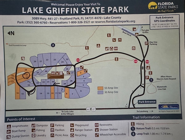 On Friday, December 8, 2023 we left Lake Louisia State Park in Clermont to drive a little less than an hour north to Lake Griffen State Park in Fruitland Park, FL for a 14-night stay. This would be our first time camping in Lake Griffen State Park and we were curious what it would be like.