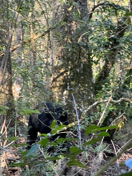 Saturday, December 9th we ate breakfast and then decided to hike over to see the state’s second oldest live oak tree. However, before we got very far we saw a huge black bear about an eighth of a mile in front of us on the trail. Cindy was whispering, “Oh my god, oh my god!” while she struggled to get her phone out to take a picture. The bear spotted us and started to climb a tree it was next to, but then opted to run off into the marsh next to the trail. Fortunately, Cindy got a few photos before we lost sight of Ursus Americanus in the overgrown bushes and trees.
