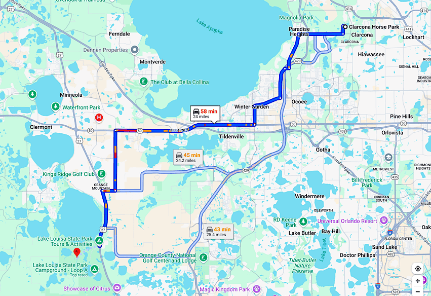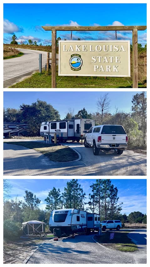 Check-out time at Clarcona Horse Park is noon, so we left there at precisely that time on Friday, December 20, 2024 and drove as slowly as we could to Lake Louisa State Park in Clermont, Florida. We still managed to arrive at 1:10 pm and had to wait in the holding area for about 20 minutes while they got our site ready. That really wasn’t as long of a wait as we expected, since check-in time is 3 pm, so we were happy.