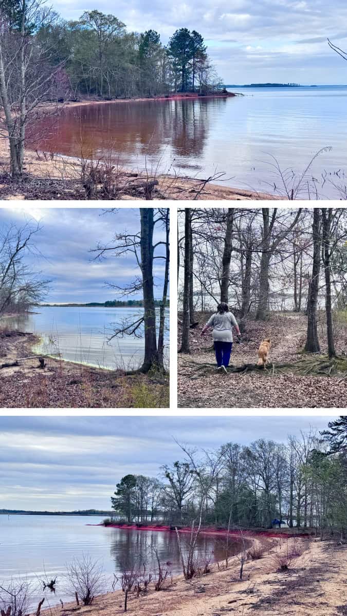 We awoke Thursday morning to the first day of Spring and cooler temps in the lower 40’s. We took Bella on her first walk through the closed campground loop and went a little beyond it on a short trail where we found someone in a tent on a small spit of land extending out into Hartwell Lake. The tent was placed so that it was hidden from the campground area by a stand of trees. We never said anything to the ranger or hosts because everybody’s got to have a place to sleep.