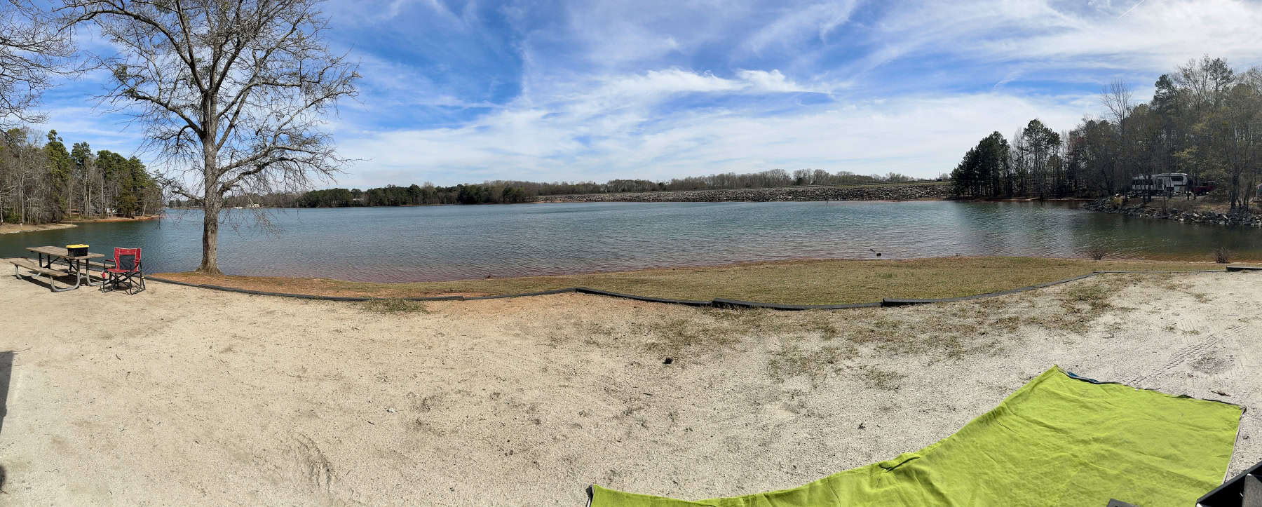 Our site was a pull-through and was supposed to be able to fit a 50-foot rig. It was still a little tight and we had to make a couple of placement adjustments to fit in because of how it was laid out and the location of trees, retaining wall, etc. Our front door looked out onto Hartwell Lake, so Cindy really enjoyed sitting out there at daybreak and watching the sunrise across the placid blue waters. We had water and electric hook-ups but the water pressure was pretty low. Just below our site was a grassy area that leads into the lake. Whenever I would take Bella out for her bathroom break late at night or before sunrise, I would always sweep my flashlight beam across the area to make sure no alligators had crawled out in the darkness.