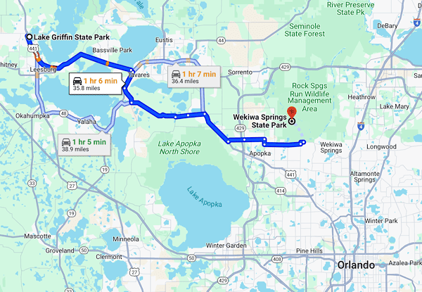 We left Lake Griffin State Park in Fruitland Park, FL on Friday, December 22, 2023 and drove a little over an hour southeast to Wekiva Springs State Park in Apopka, FL, just north of Orlando. We like to be at this campground during the holidays as it is not too far from our Florida kids/grandkids.