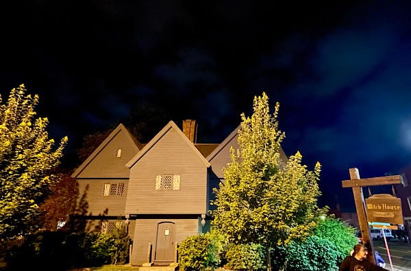 That evening it was back to Salem at 8:15 pm for the History and Hauntings of Salem Guided Walking Tour with our tour guide Ryan and about 30 fellow tour members. Ryan was very knowledgeable AND entertaining during our 2 1/2 hour nighttime tour around the major “haunts” of Salem. I also appreciated that he dressed in normal street clothes. We saw other tour groups where the tour leader was costumed as a witch, a warlock, a Puritan, and a “ghost”. I would have silly following such a person around the streets and alleys of Salem. As the title of the tour implies, we heard not only ghost stories but interesting history as well and saw lots of fascinating homes, buildings, cemeteries and streets during our tour.