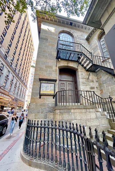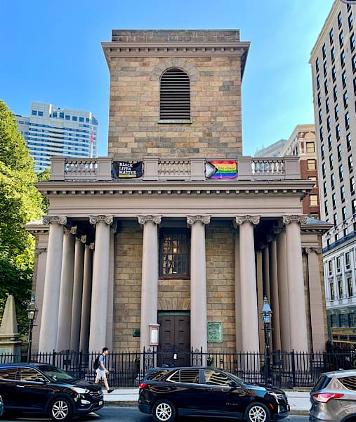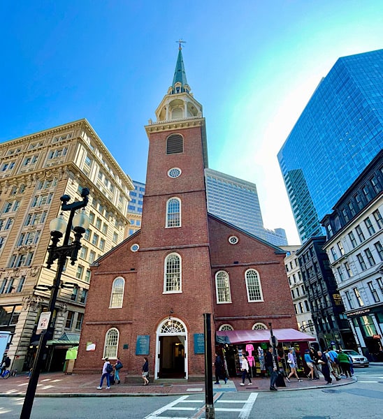 Most people follow the Trail from South to North but if you’ll look at the map in the photo album you’ll see we walked it in the opposite direction. Since we got off the train at the North Station we walked up the street to begin our walk from Copp’s Hill Burying Ground (skipping the USS Constitution and Bunker Hill stops farther north) and ending up at Boston Common. The Freedom Trail stops include buildings, graveyards, churches and ground markers. The Trail is marked through the city by a “ribbon” of dual red bricks on the ground for ease of following (except where it was interrupted by construction) or banners mounted on poles at strategic points.